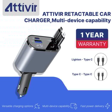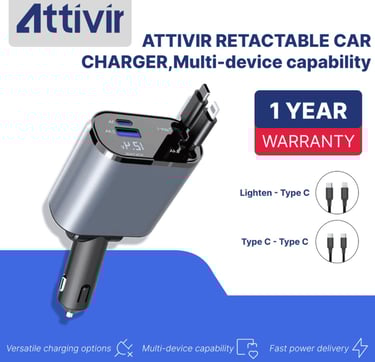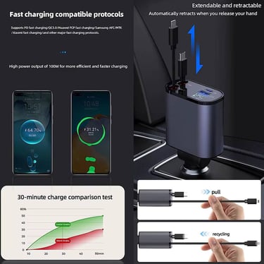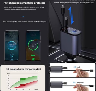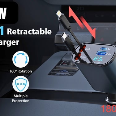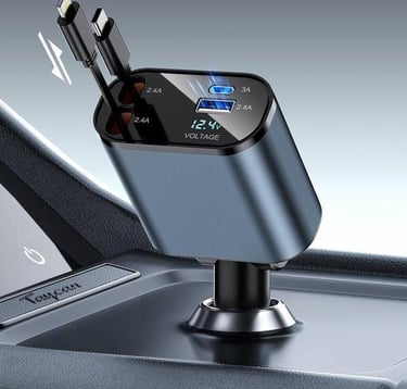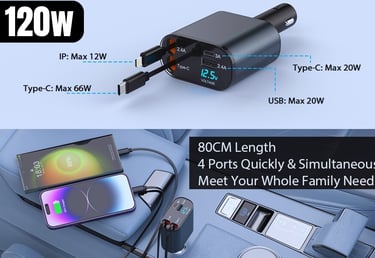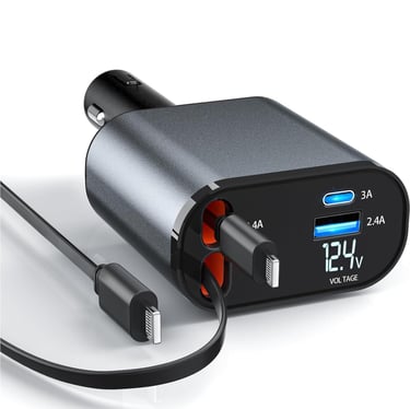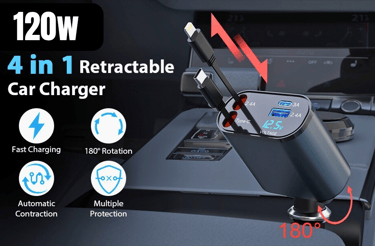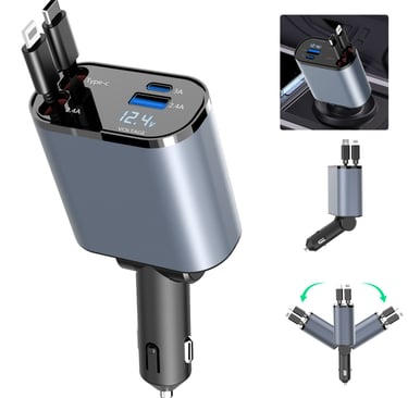 Vous en avez assez des câbles emmêlés dans votre voiture ? Nous vous présentons le chargeur voiture rapide rétractable 120 W (4-en-1), la solution idéale pour garder vos appareils chargés et votre voiture organisée et sans encombrement. Ce chargeur n'est pas qu'un simple outil de charge ; c'est un système d'alimentation complet, spécialement conçu pour s'adapter à votre mode de vie nomade.