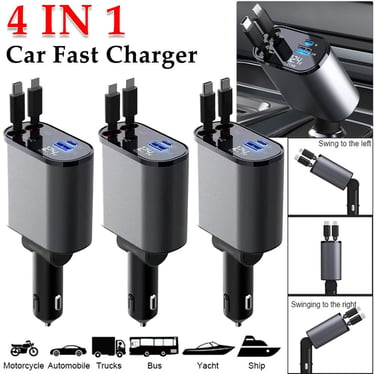 Chargeur Rapide de Voiture 4 en 1 - Tête Pivotante & Câbles Rétractables Intégrés